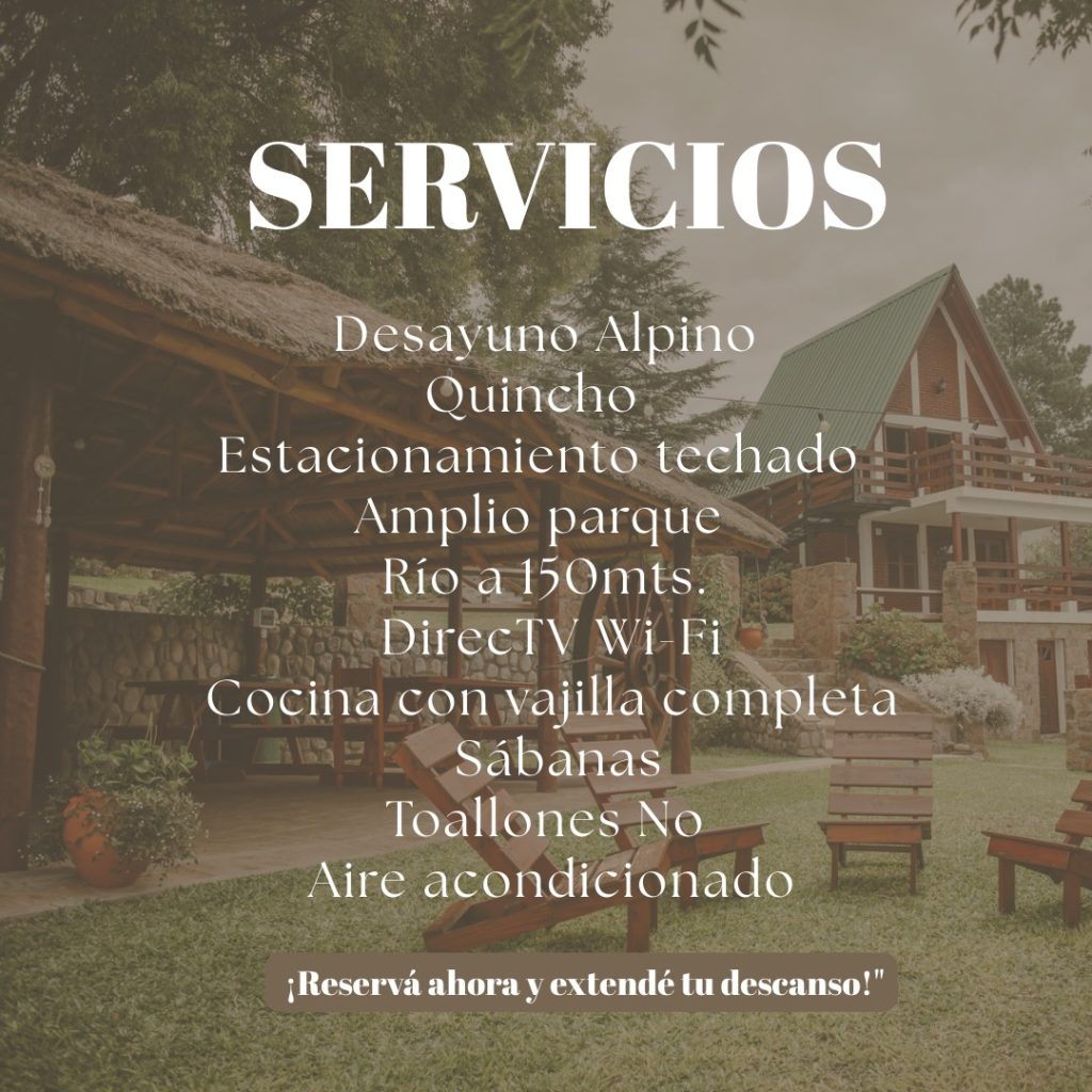 - Es un apart de montaña, ubicado en calle Cabalango 54, tenemos 5 departamentos, 2 monoambientes 5 personas y tres de un dormitorio para 5 personas también, todos los departamentos están completamente equipados. Tenemos pileta con bajada propia al río, asadores y cochera semi cubierta para cada departamento. Brindamos servicio de mucama, ropa blanca y desayuno. Estamos abiertos todo el año. El teléfono es 3541216273